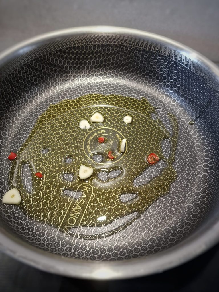 En una sartén, calienta el aceite de oliva virgen extra y dora un diente de ajo cortado en láminas junto con media guindilla fresca.