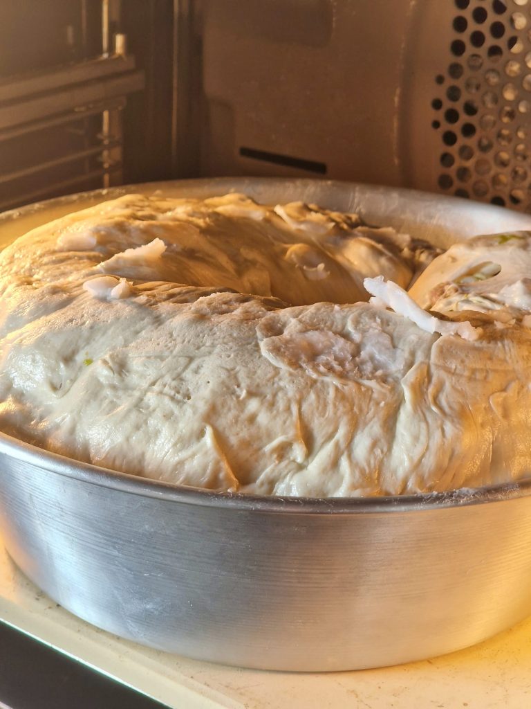Transfiere el tortano a un molde para roscón, previamente engrasado con manteca de cerdo. Cubre con film de cocina y colócalo nuevamente en el horno apagado para que leude hasta que el tortano haya alcanzado el borde del molde.