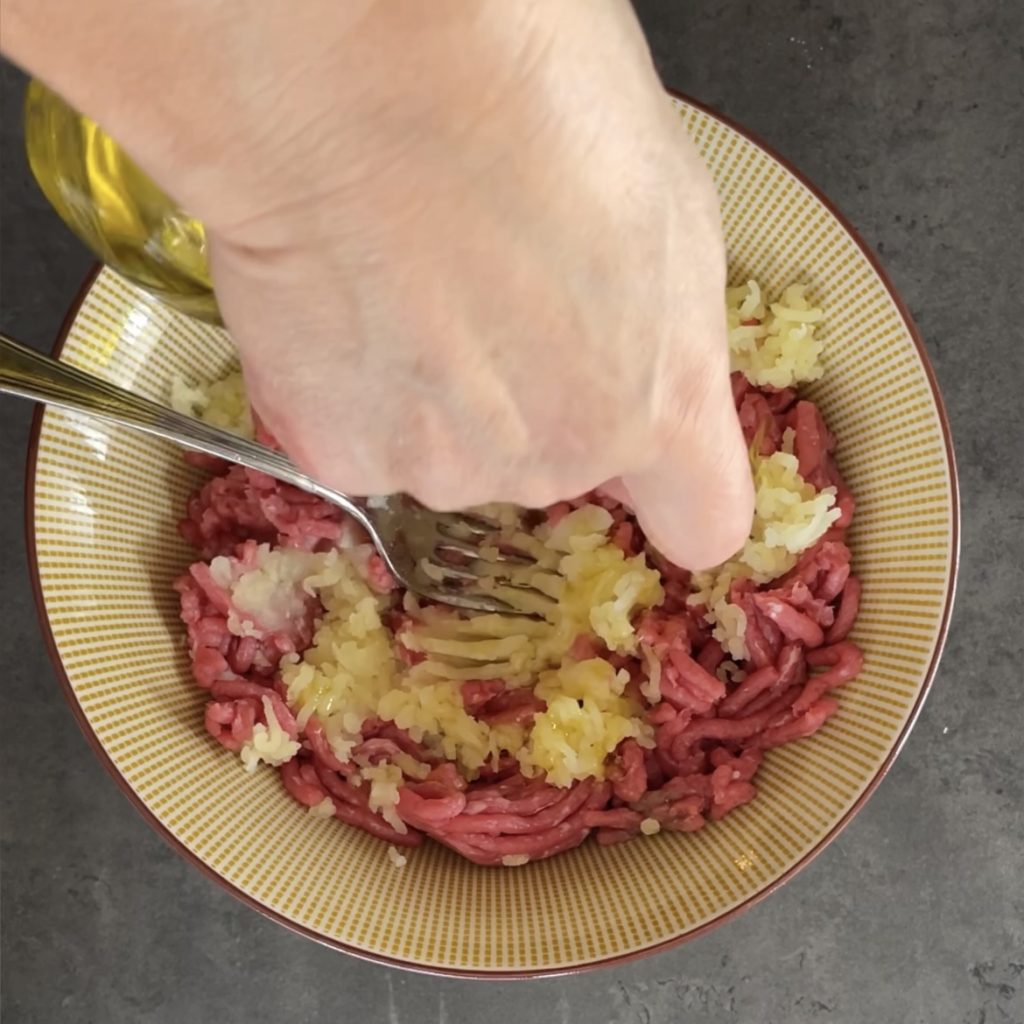 • Comenzamos a preparar las Albóndigas a la cerveza, cocer una patata o cocerla al vapor, vierte la carne picada en un bol, añade la patata cocida y triturada,