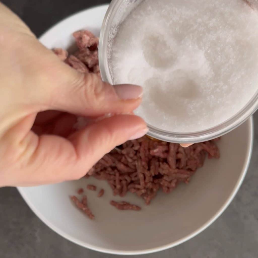 Comenzamos a preparar las Albóndigas a la naranja, verted la carne molida en un bol, añadid el huevo,
