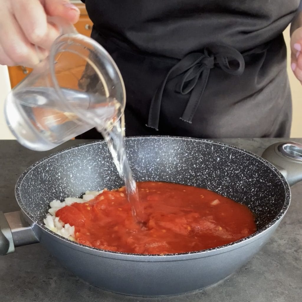 y el agua, ponlo al fuego y deja cocinar a fuego bajo y con tapa mientras preparas las albóndigas.