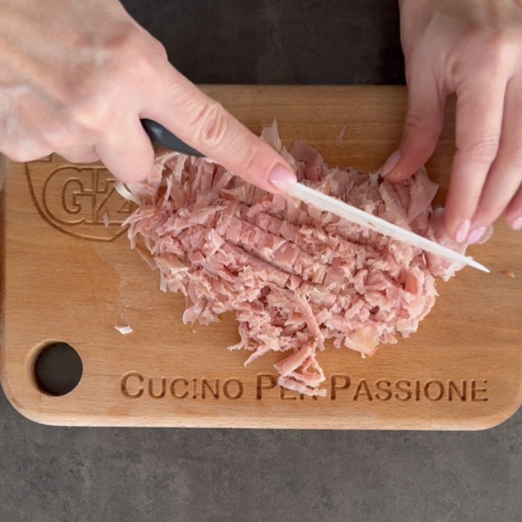 Comenzamos a preparar las albóndigas con jamón cocido, pica finamente la cebolla,