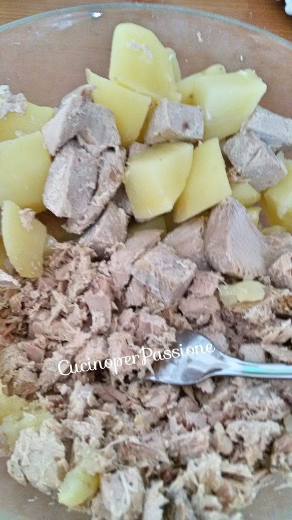 • Verted en una cacerola grande el atún y las patatas, cubrid con abundante agua, añadid las hojas de laurel y una pizca de sal, cocinad durante 30 minutos, luego escurrid y pasad a un bol