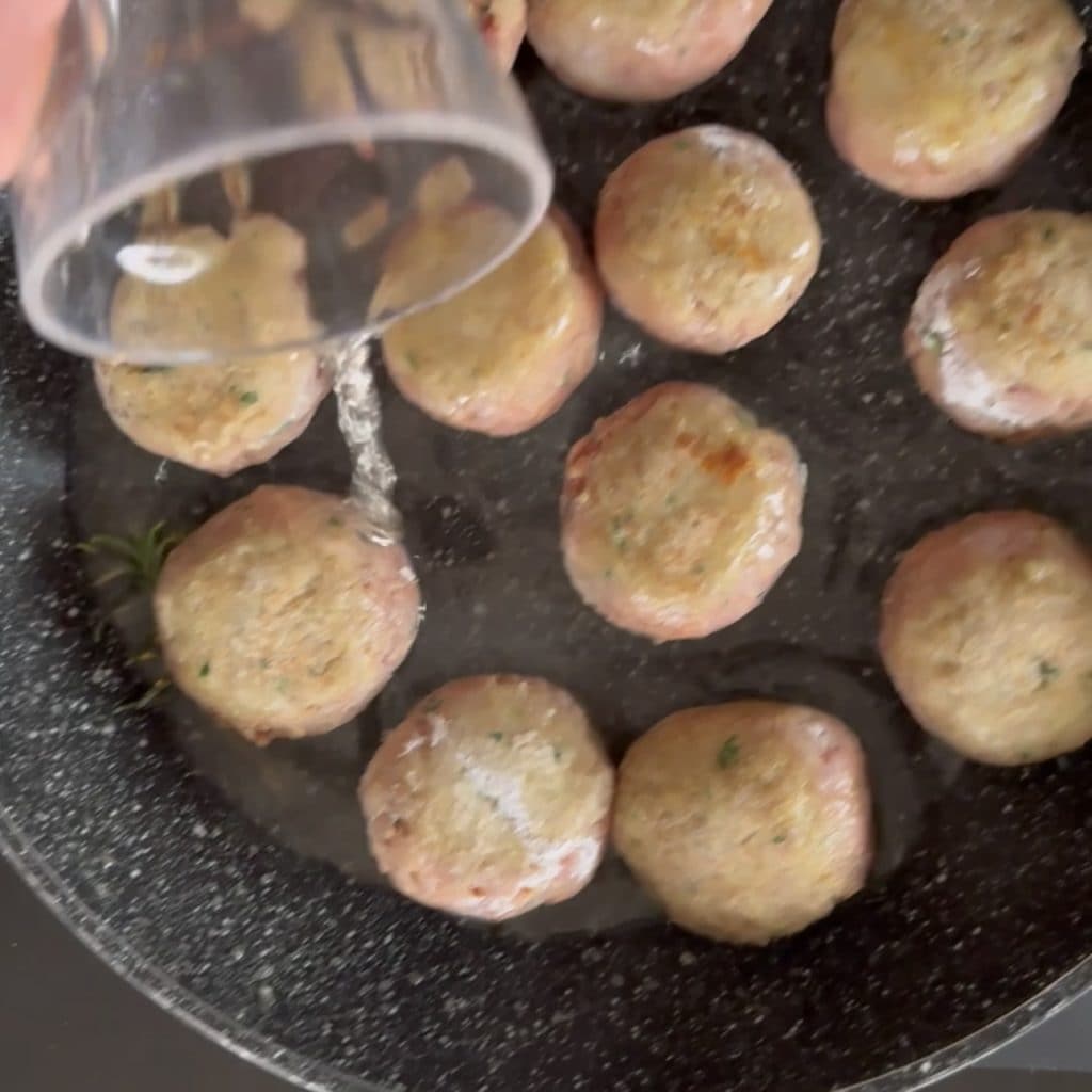 y añadid las albóndigas, dándoles vueltas a menudo para dorarlas y que se forme una costra dorada,