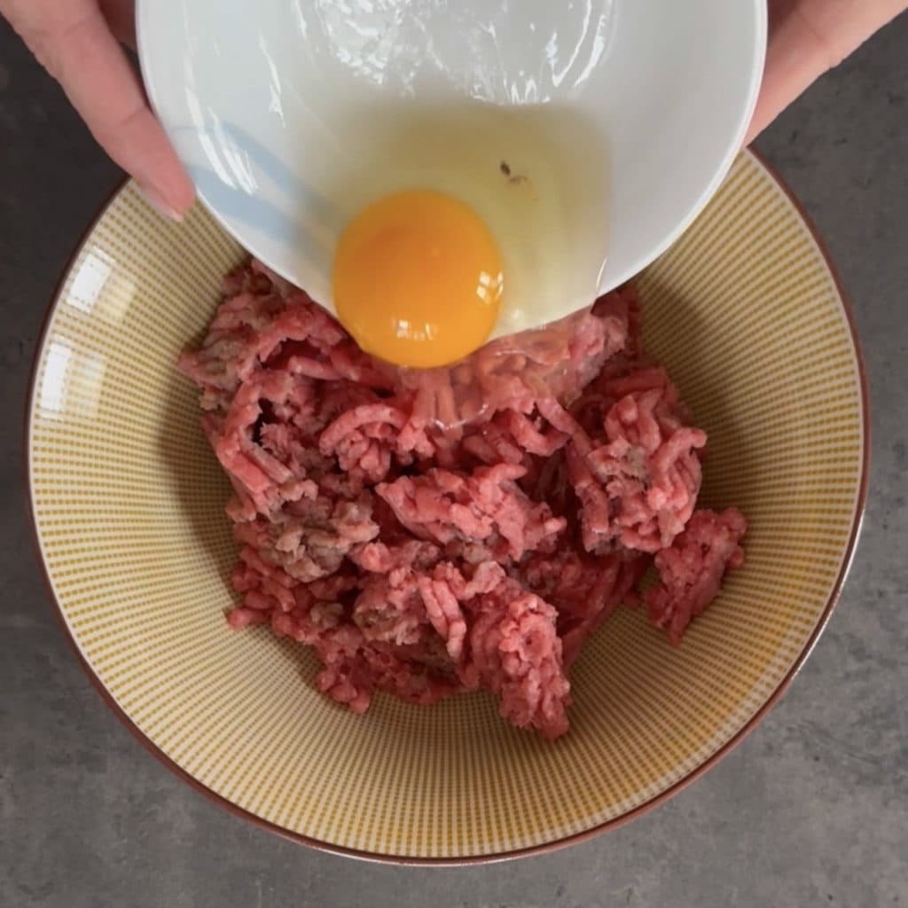 Verted en un bol, la carne molida, aplastadla ligeramente con un tenedor y añadid el huevo,