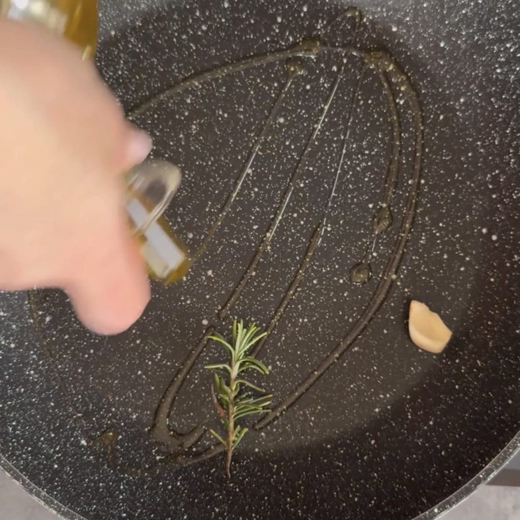 Verted en una sartén aceite de oliva virgen extra, el diente de ajo y el romero, dejad sazonar por unos minutos y