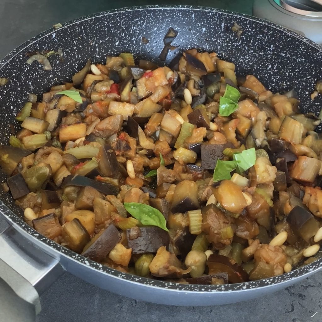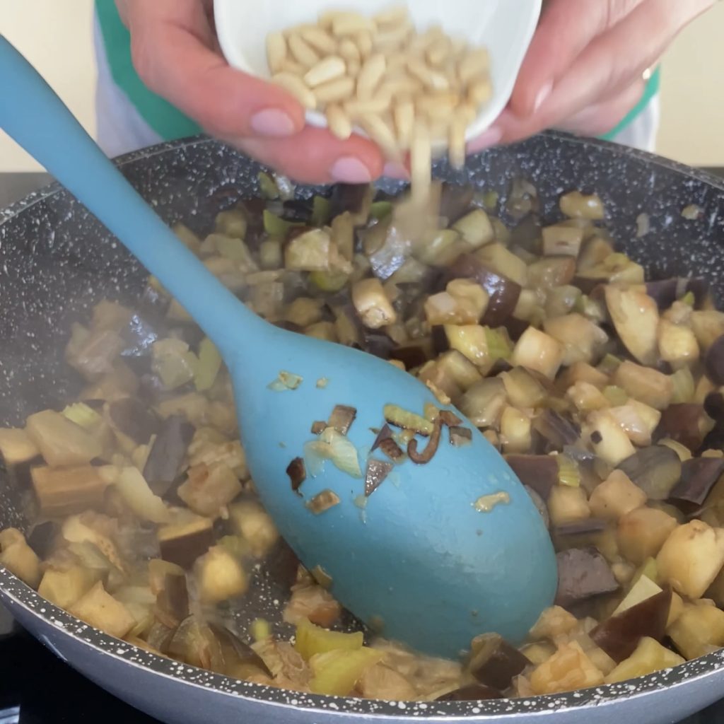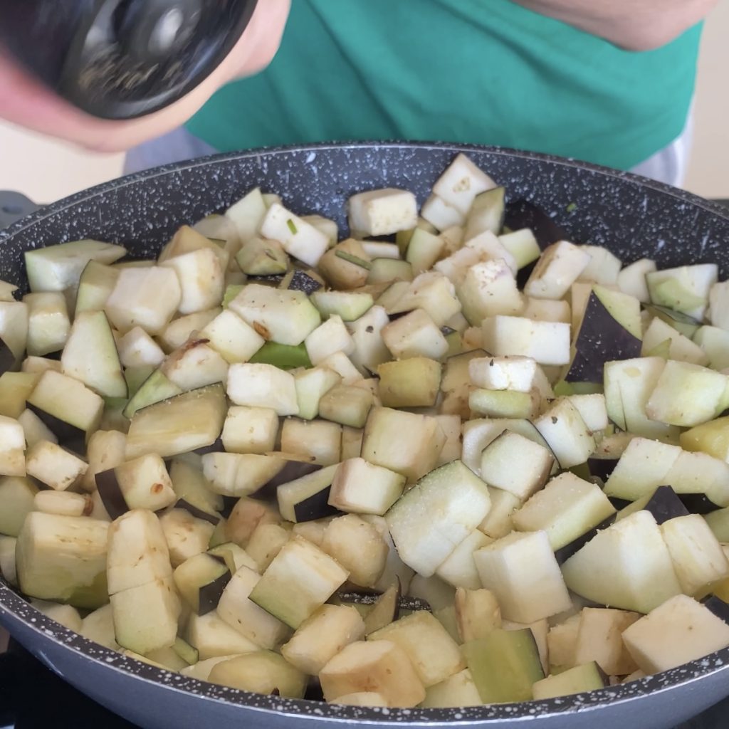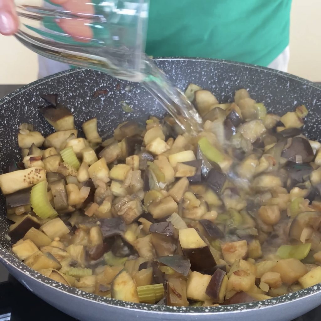 Luego poned los trozos de berenjena en la sartén con el apio y la cebolla,