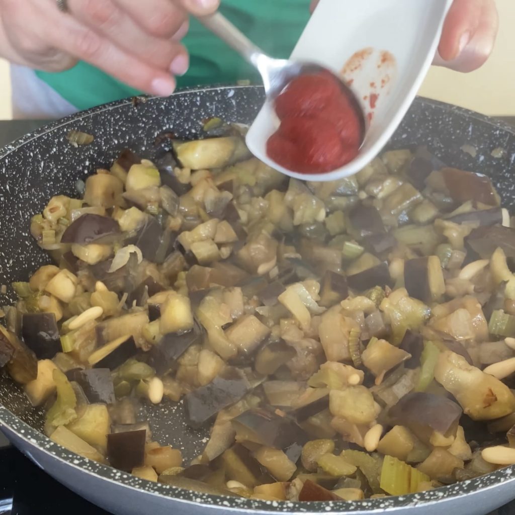 y el triple concentrado de tomate, continuad la cocción durante otros 5 minutos para que las berenjenas adquieran más sabor.