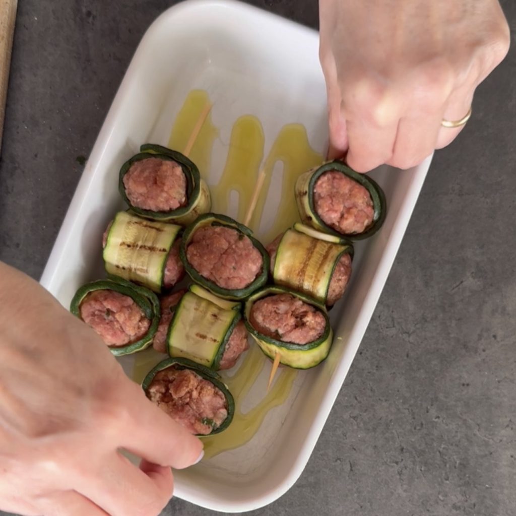 Toma una rodaja de calabacín y enróllala alrededor de la albóndiga. Continúa de esta manera hasta terminar los ingredientes.