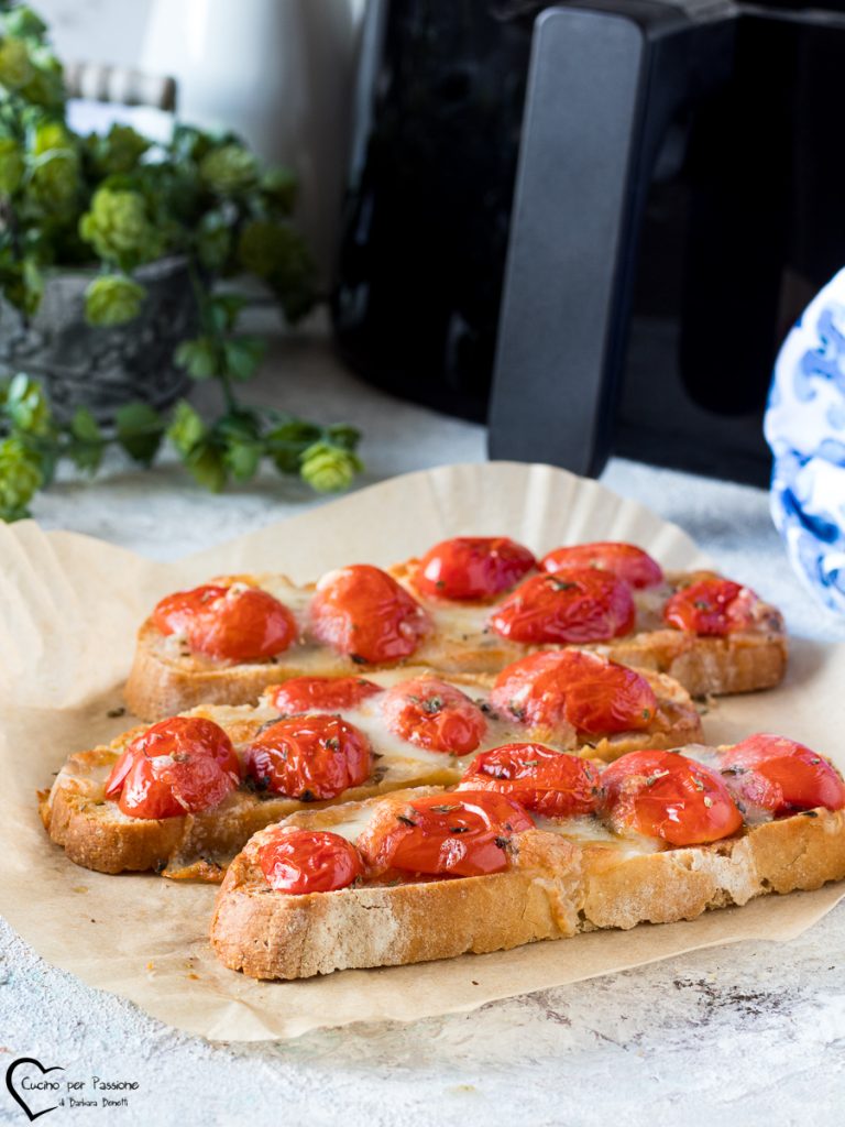 Bruschetta en freidora de aire un entrante fácil y rápido que podéis consumir también como alternativa al almuerzo o la cena. Las bruschettas cocidas en freidora de aire las podéis preparar también con rebanadas de pan duro y luego aderezarlas al gusto de la manera que más os guste, simplemente con mozzarella y tomatitos como hice yo o añadiendo también champiñones, alcachofas, atún, en fin lo que más os apetezca. Ahora vamos a ver cómo hacer la bruschetta en freidora de aire y si la probáis, hacédmelo saber. Barbara