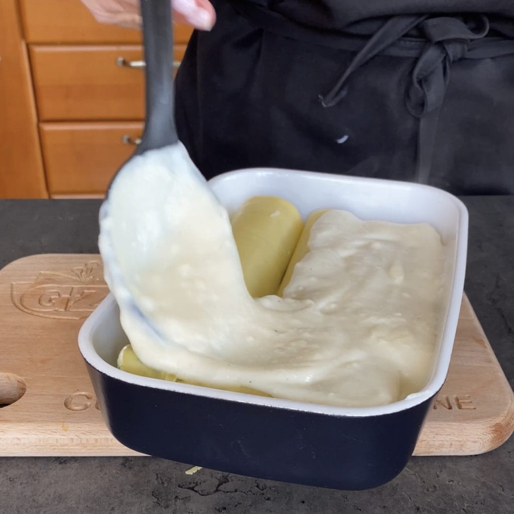 Añade bechamel sobre los canelones y si te gusta, espolvorea con un poco de queso rallado.