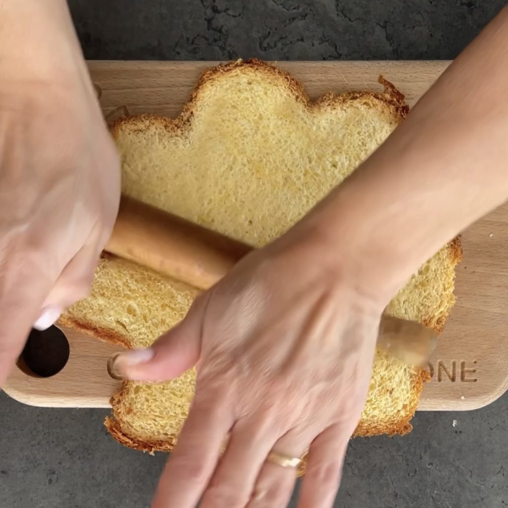 Toma un círculo de pandoro, coloca el molde en el centro y moja un poco el borde con agua