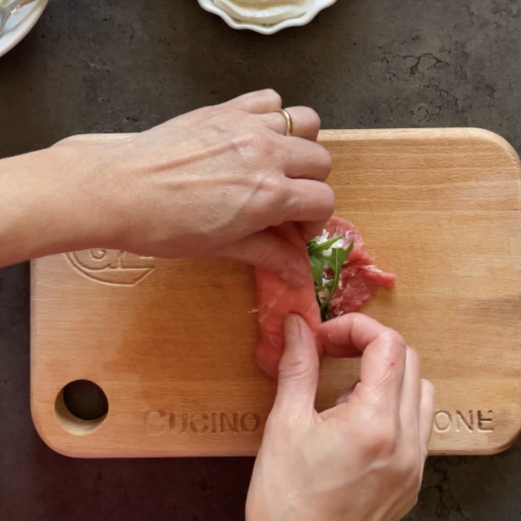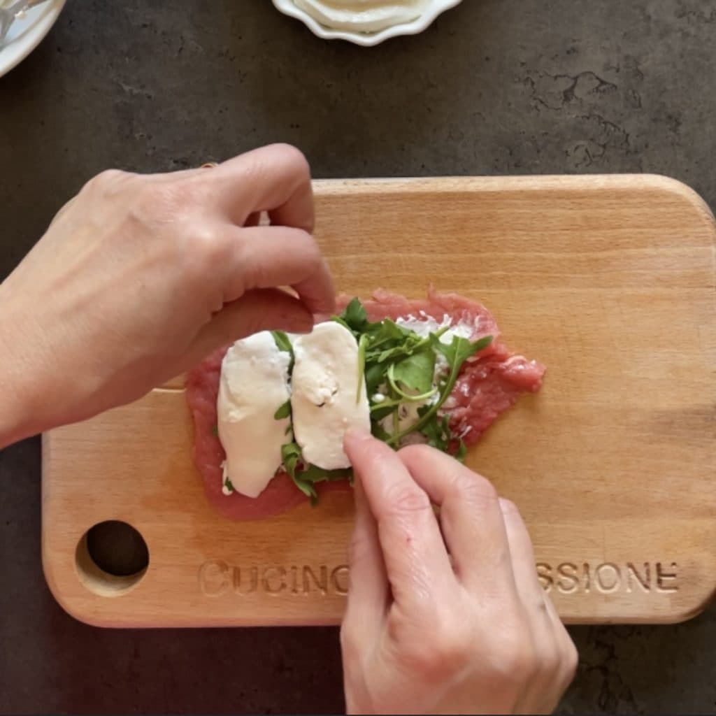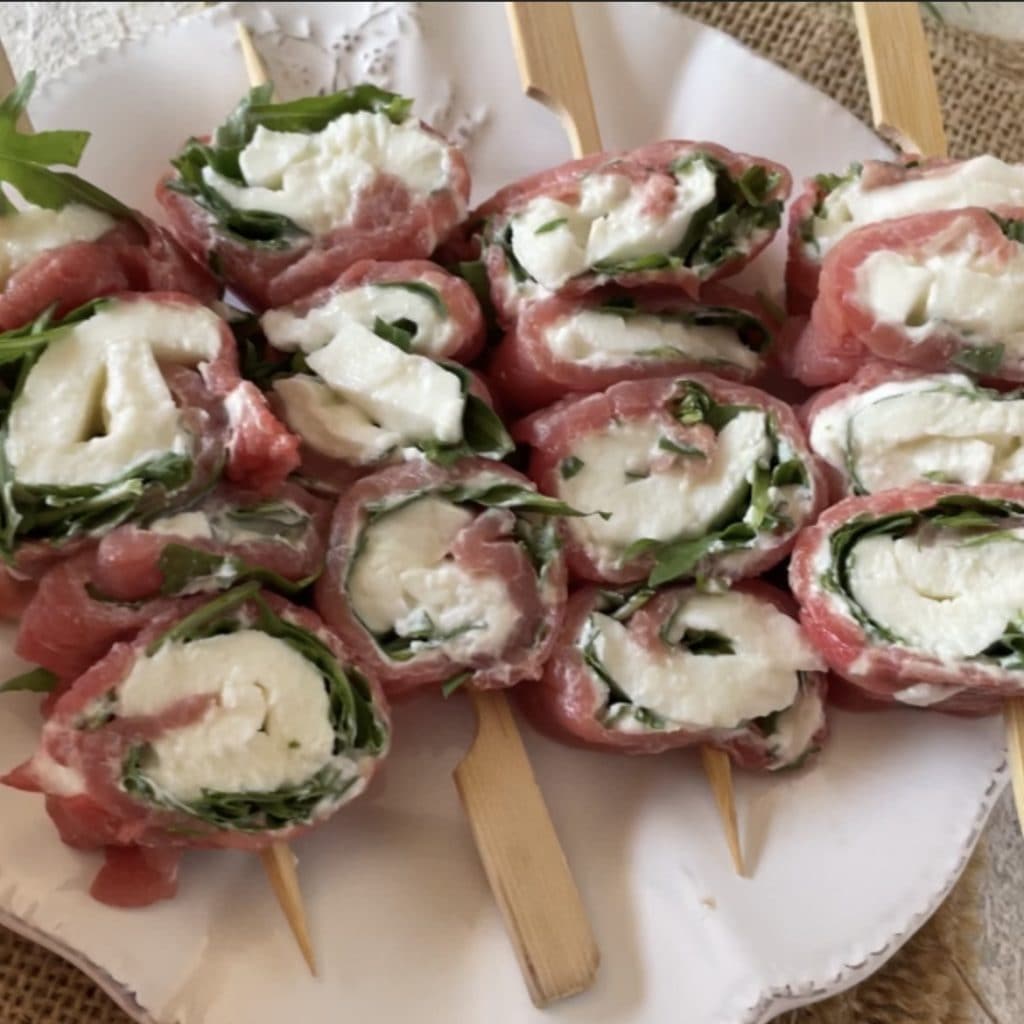 Comenzamos a preparar los pinchos con el Carpaccio de ternera, cortad la mozzarella en lonchas finas