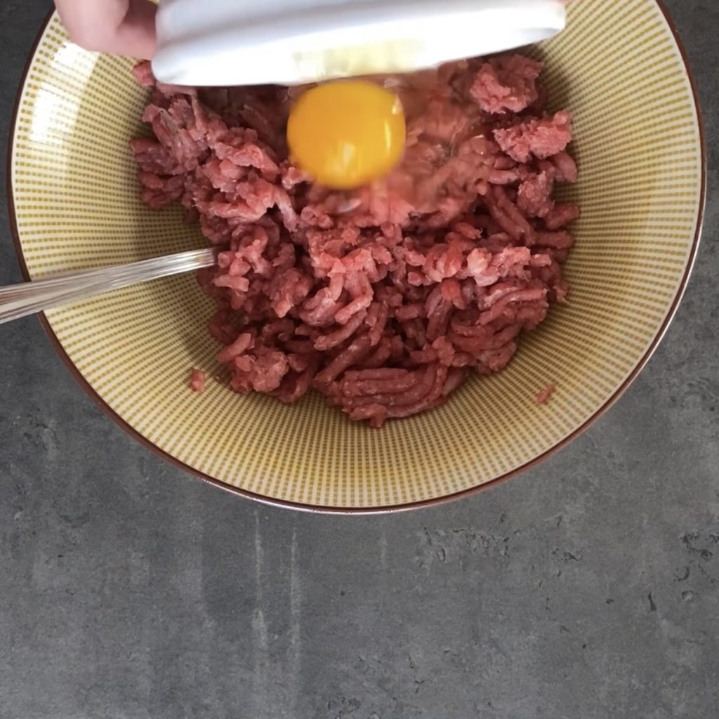 Vierte en un bol la carne picada, el huevo,