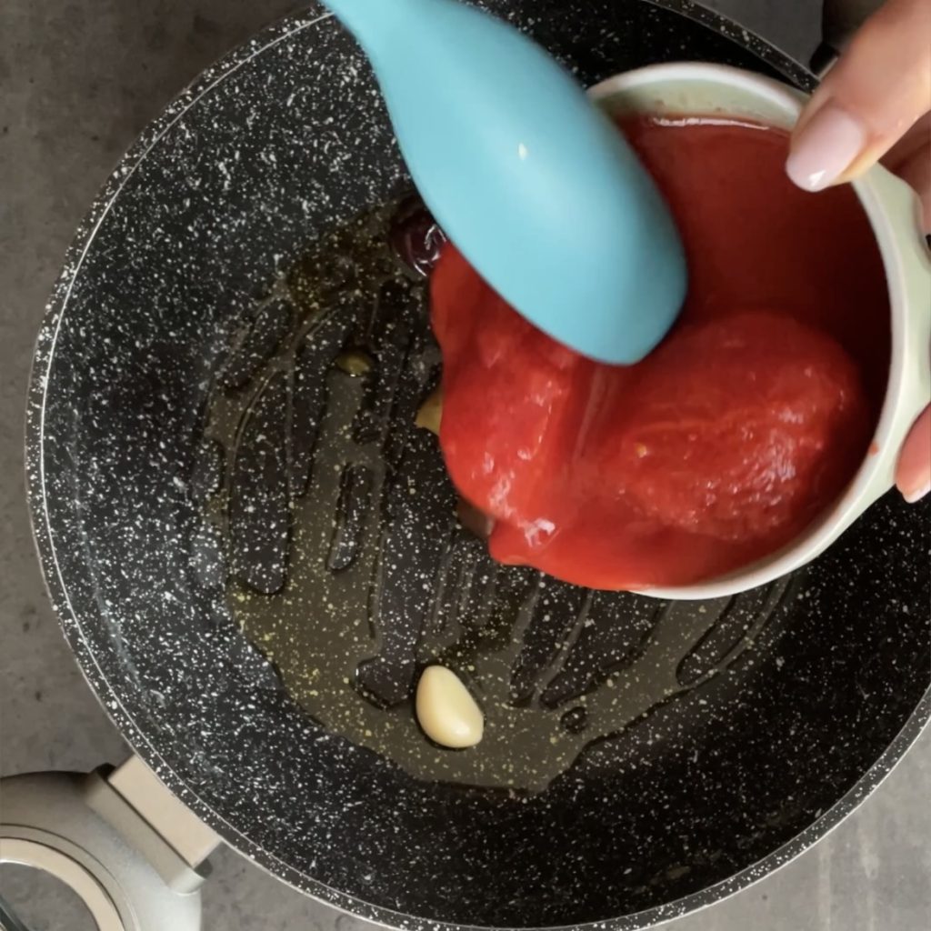 Verted un poco de aceite de oliva virgen extra en una sartén, añadid un diente de ajo,