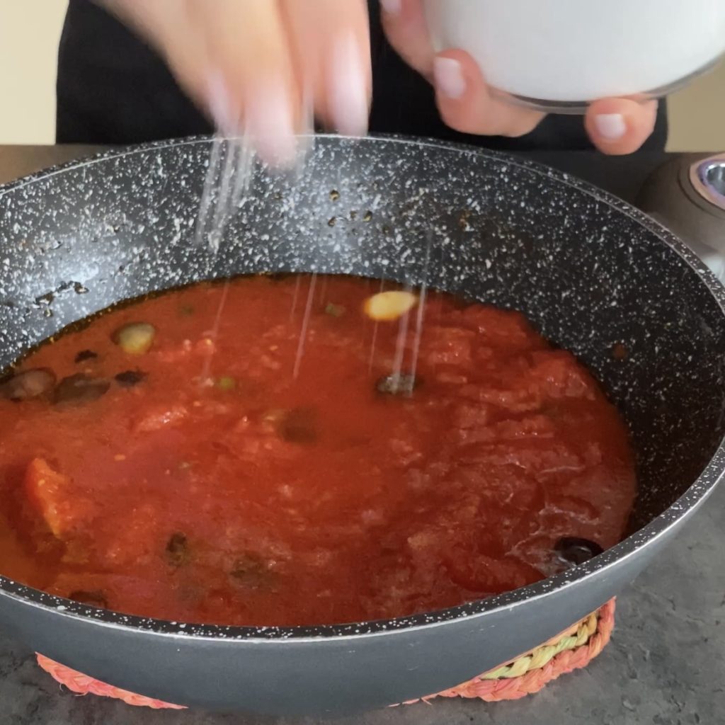 Con la ayuda de una cuchara, añadid la salsa sobre la coliflor, poned al fuego y cocinad durante 10 minutos, si la salsa está demasiado espesa podéis añadir un poco de agua.