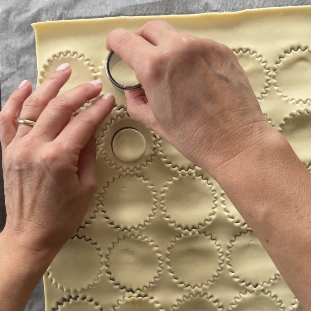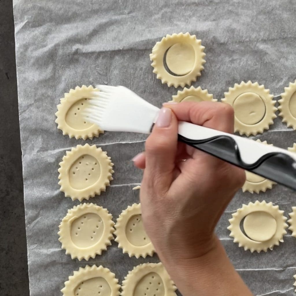 • 10 déjalos enteros, serán la base. Los otros 20, con la ayuda de un cortapasta pequeño (yo usé uno de 3 centímetros), hazles un agujero en el centro para obtener los círculos perforados que servirán para los bordes. Los restos de masa de hojaldre los puedes usar para hacer pizzitas o saladitos.