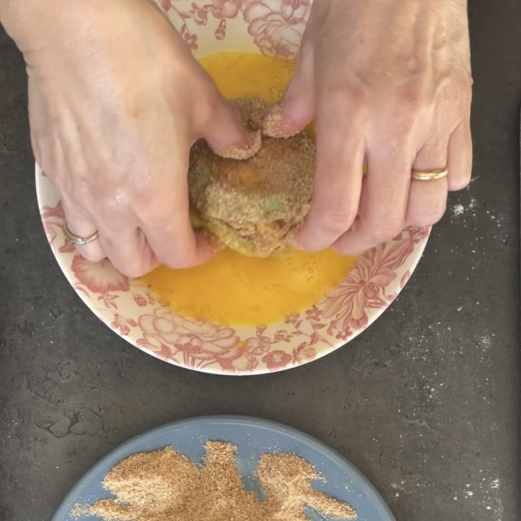 y por el pan rallado, gracias a esta doble capa de pan tendrás calabacines crujientes por fuera y tiernos por dentro, asegúrate de hacer una capa bien hecha para sellar bien los calabacines y así el queso no se saldrá.