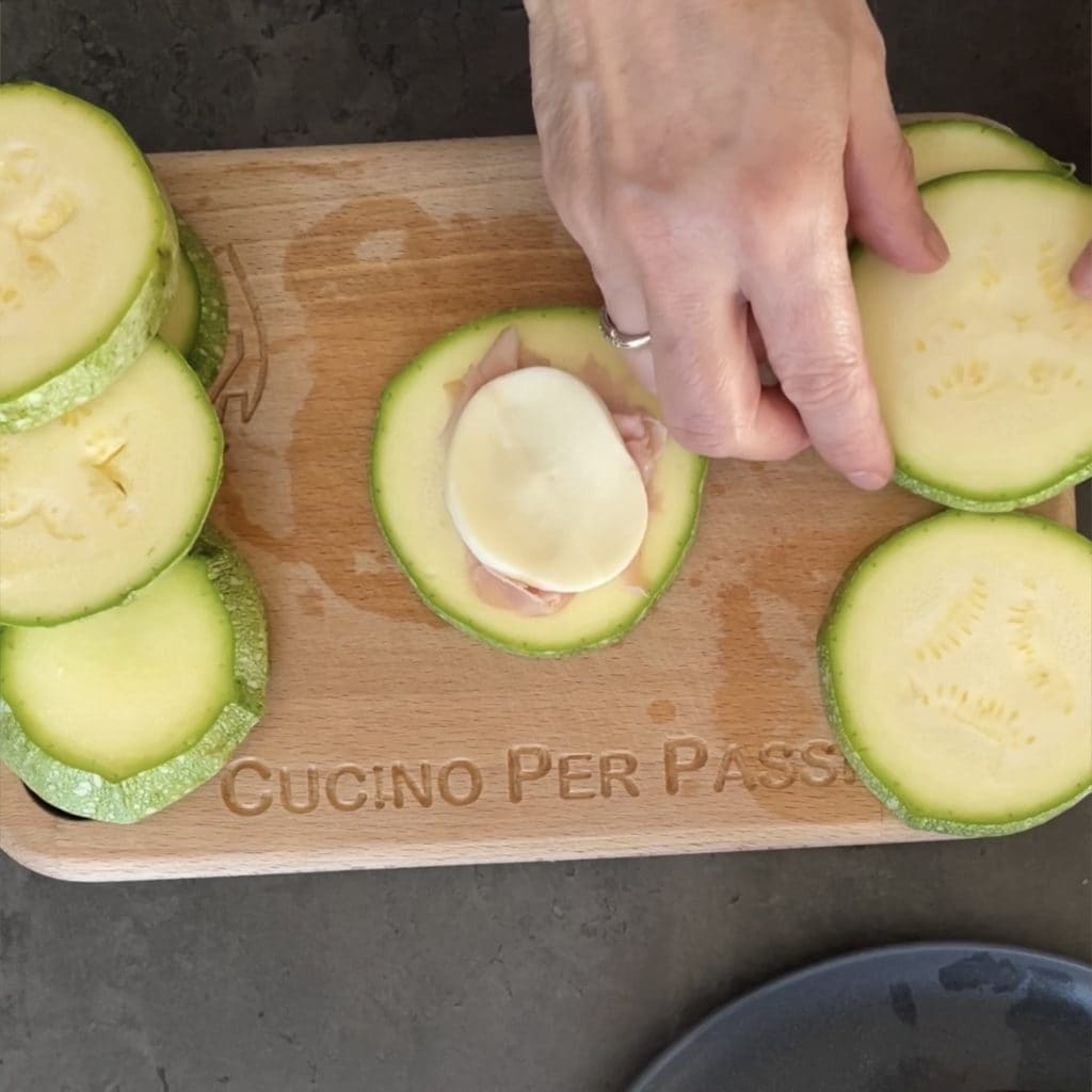 Toma ahora una rodaja de calabacín y coloca en el centro una loncha de jamón cocido,