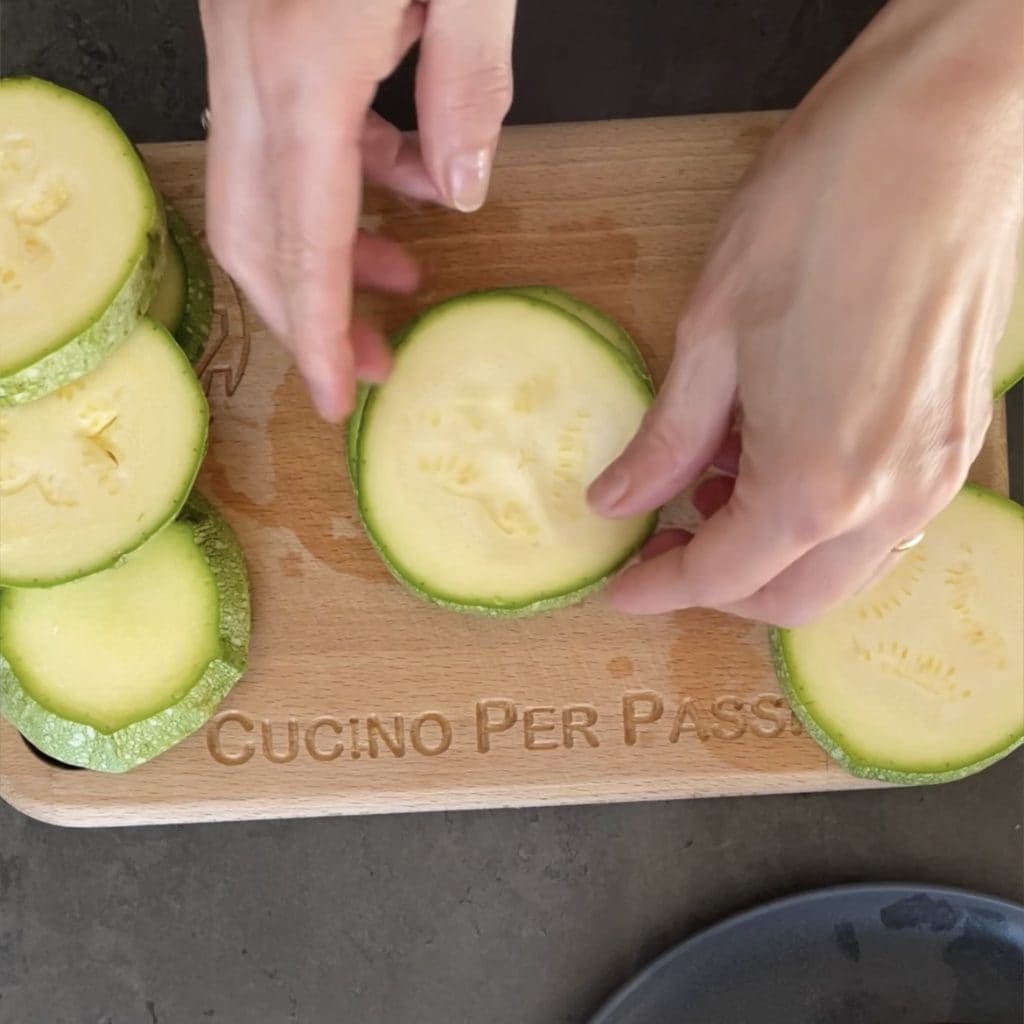 Cubre con la segunda rodaja de calabacín redondo, procede de esta manera también con las restantes rodajas de calabacín.