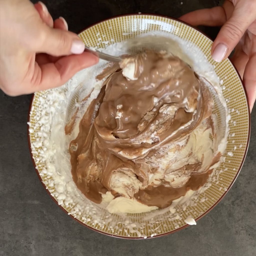 Incorpora con un tenedor y con movimientos de arriba hacia abajo para no desmontar la nata,