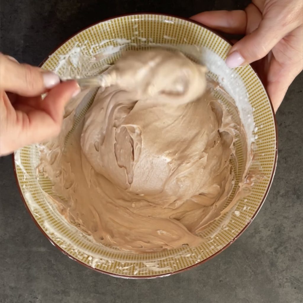 Toma la crema kinder de la nevera y transfiérela a una manga pastelera
