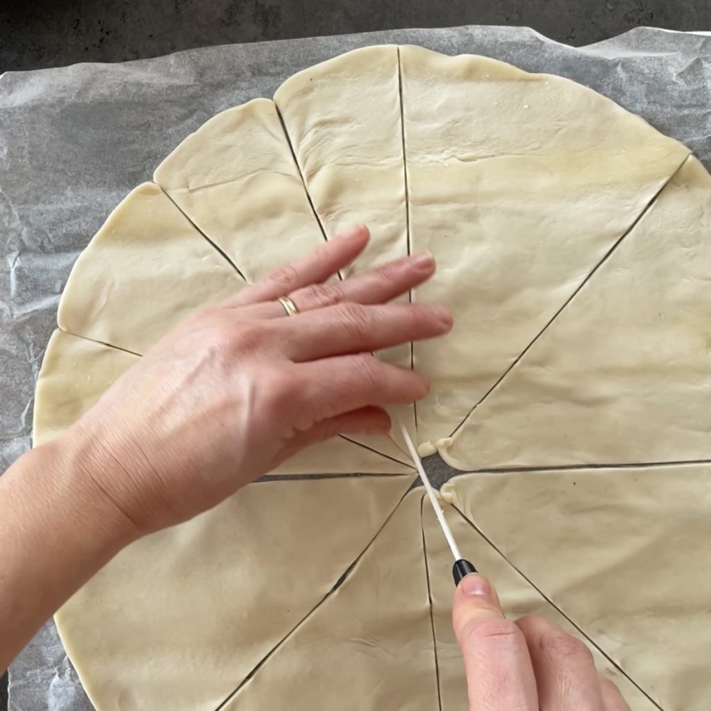 Enrollad el hojaldre sobre sí mismo, sin apretarlo demasiado, dadle forma de cruasán y colocadlo en el papel de horno con la parte más estrecha hacia abajo.