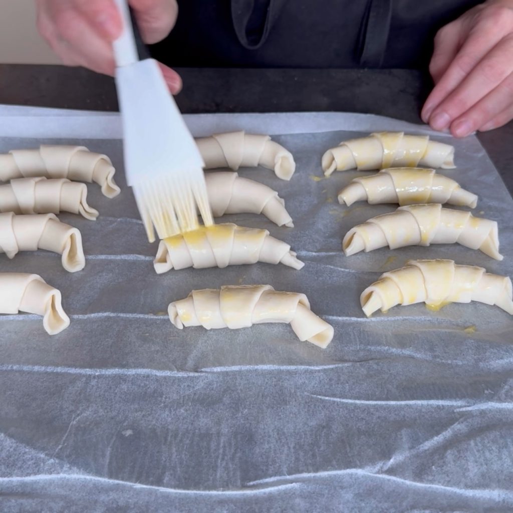 enrolla cada trozo, sin apretarlo demasiado, dándole la forma curvada del cruasán y colócalo en la bandeja del horno forrada con papel de horno,