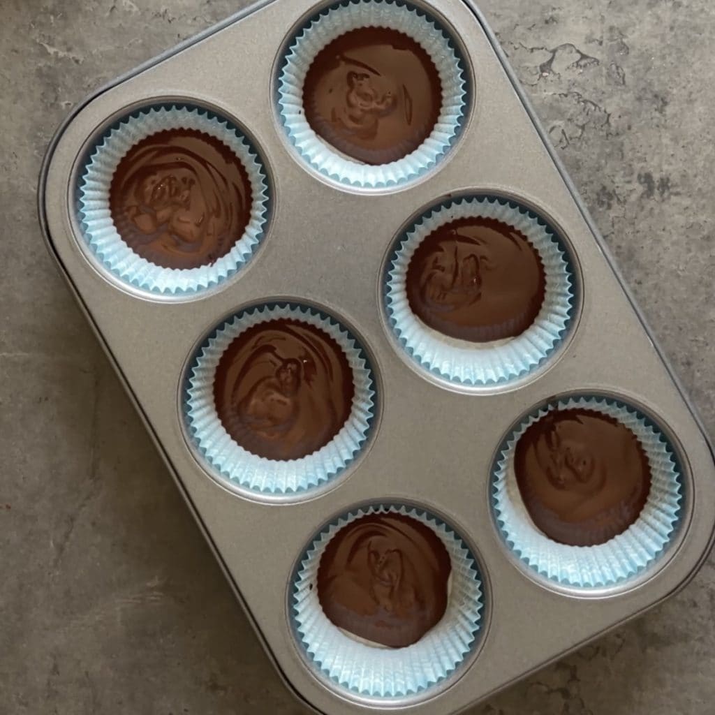Coloca en el molde para muffins los moldes de papel, vierte en cada uno una primera capa de chocolate fundido.