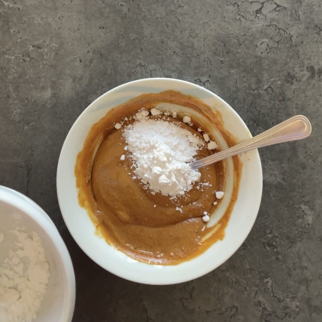 Vierte en un bol la mantequilla de cacahuete y el azúcar glas y mezcla bien.