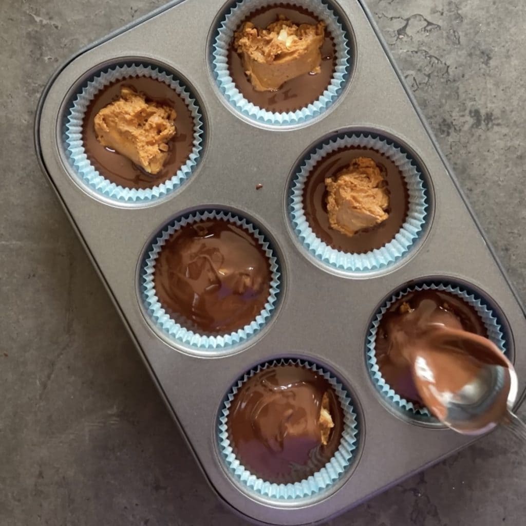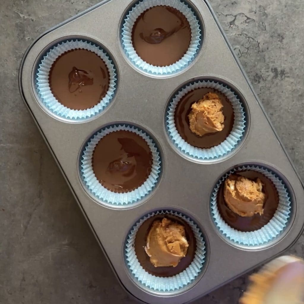 Vierte una cucharada de mantequilla de cacahuete y frutos secos en el centro de cada molde.