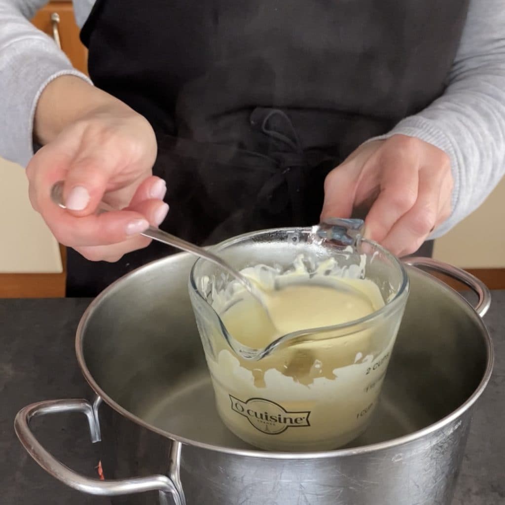 viértanlo en una jarra con asa para poder sujetarla a la olla con el agua caliente para derretirlo al baño maría. Si no tienen una jarra, pueden verterlo en una cacerola más pequeña que la olla que contiene el agua.