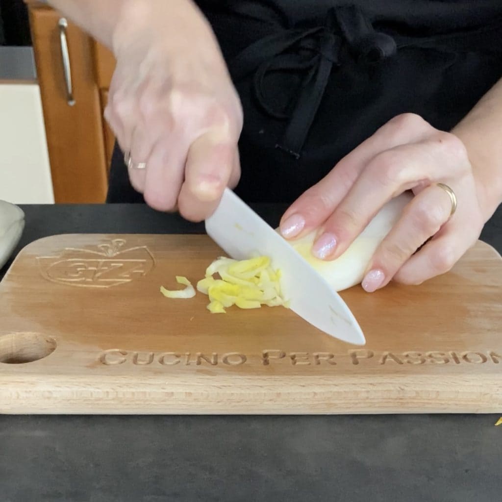• Lava los cogollos de endivia belga, elimina las hojas externas que estén manchadas o en mal estado y córtala finamente, consérvala luego en el plato para servir.