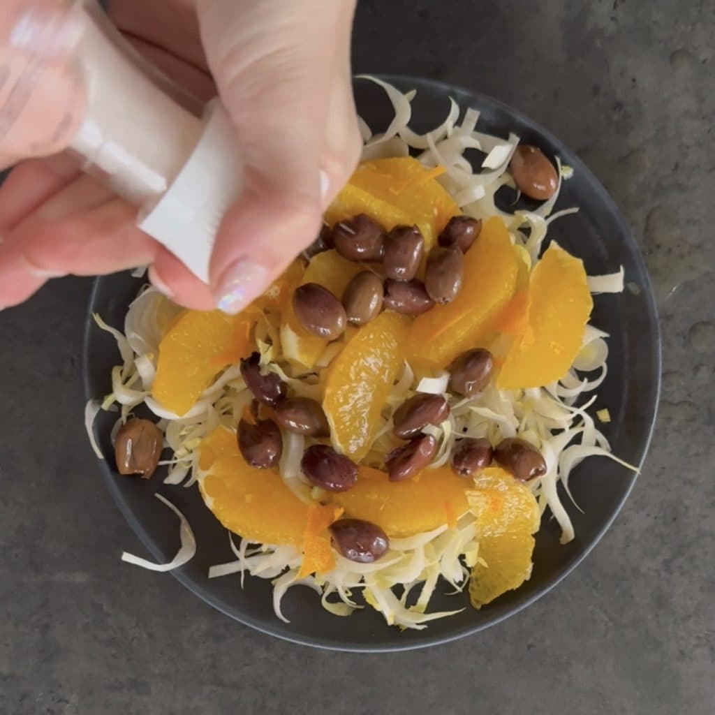 • Coloca luego los gajos de naranja a vivo sobre la endivia belga,