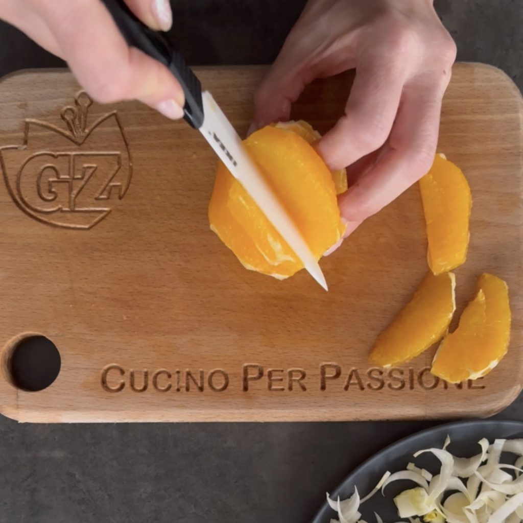 • Empezamos a preparar la Ensalada con endivia belga, lava bien la naranja, con un pelador de patatas retira parte de la cáscara, teniendo cuidado de no llevarte también la parte blanca porque es amarga,