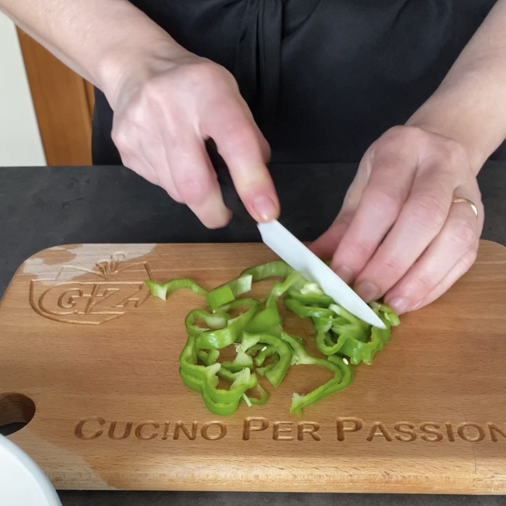 Cortad también el pimiento verde, eliminad las semillas internas y luego en pedazos pequeños, vertedlo en el bol.