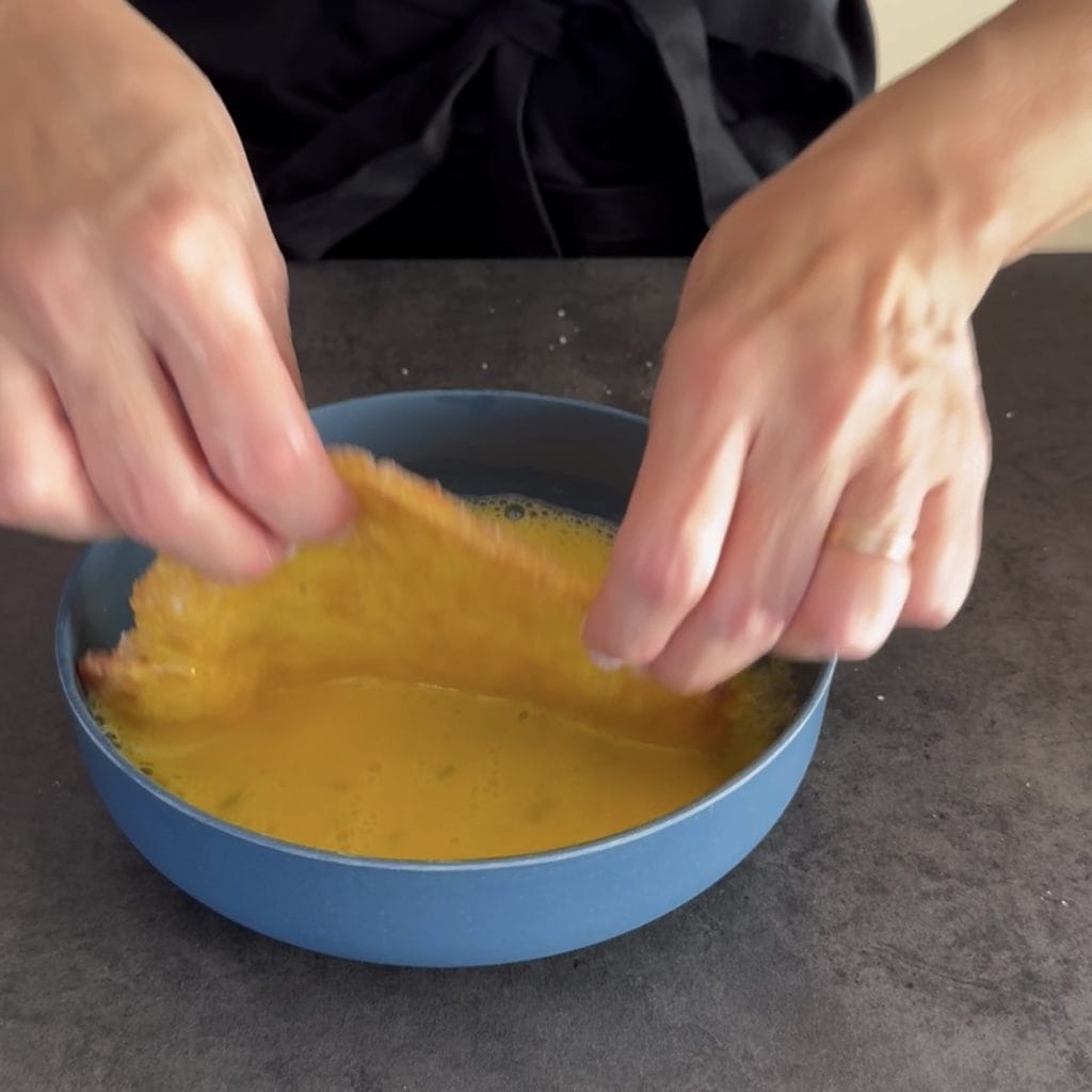 Comenzamos a preparar los filetes empanados rellenos, pasad las lonchas por el huevo batido,