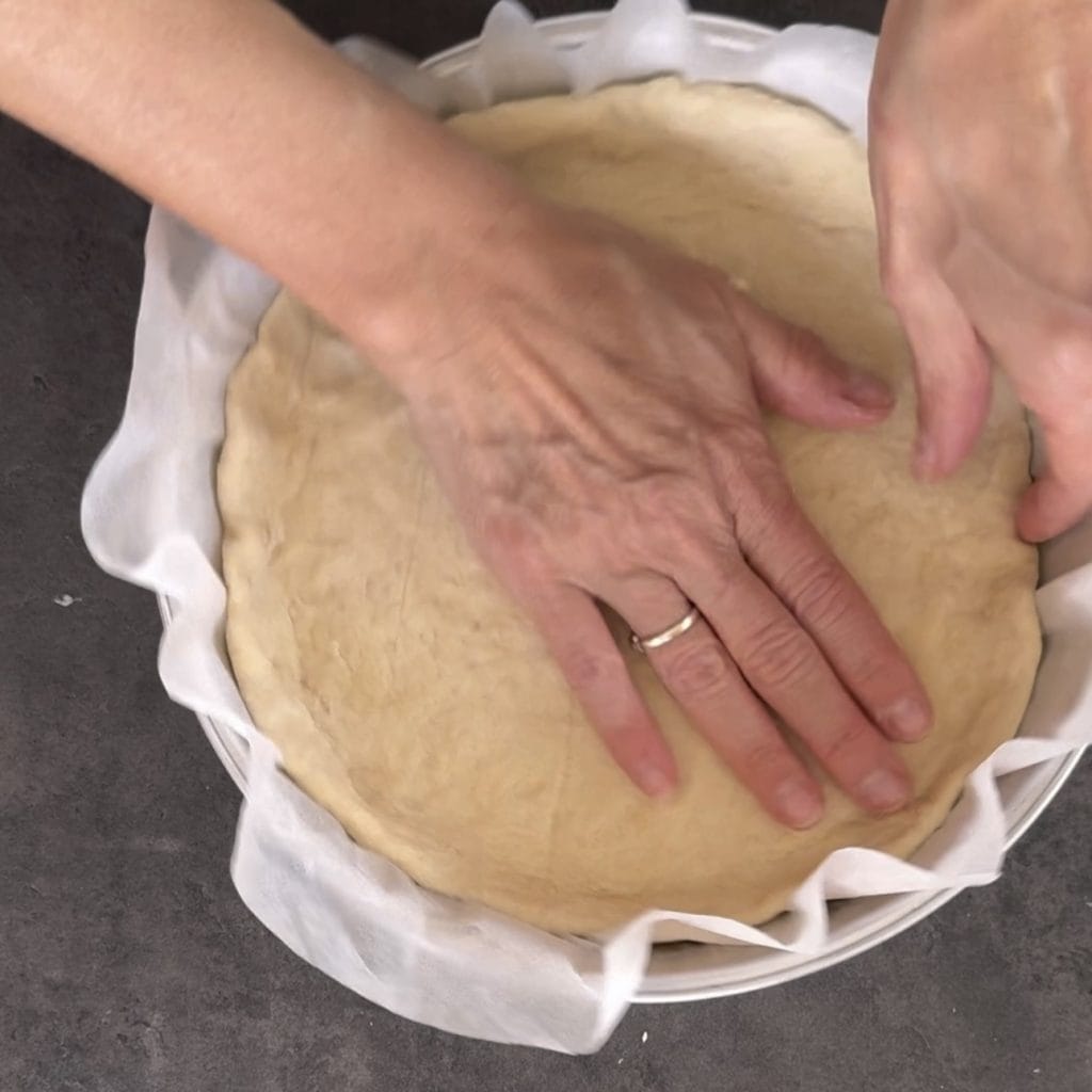• Cubrid con la otra masa previamente extendida y cerrad la focaccia doblando los bordes,