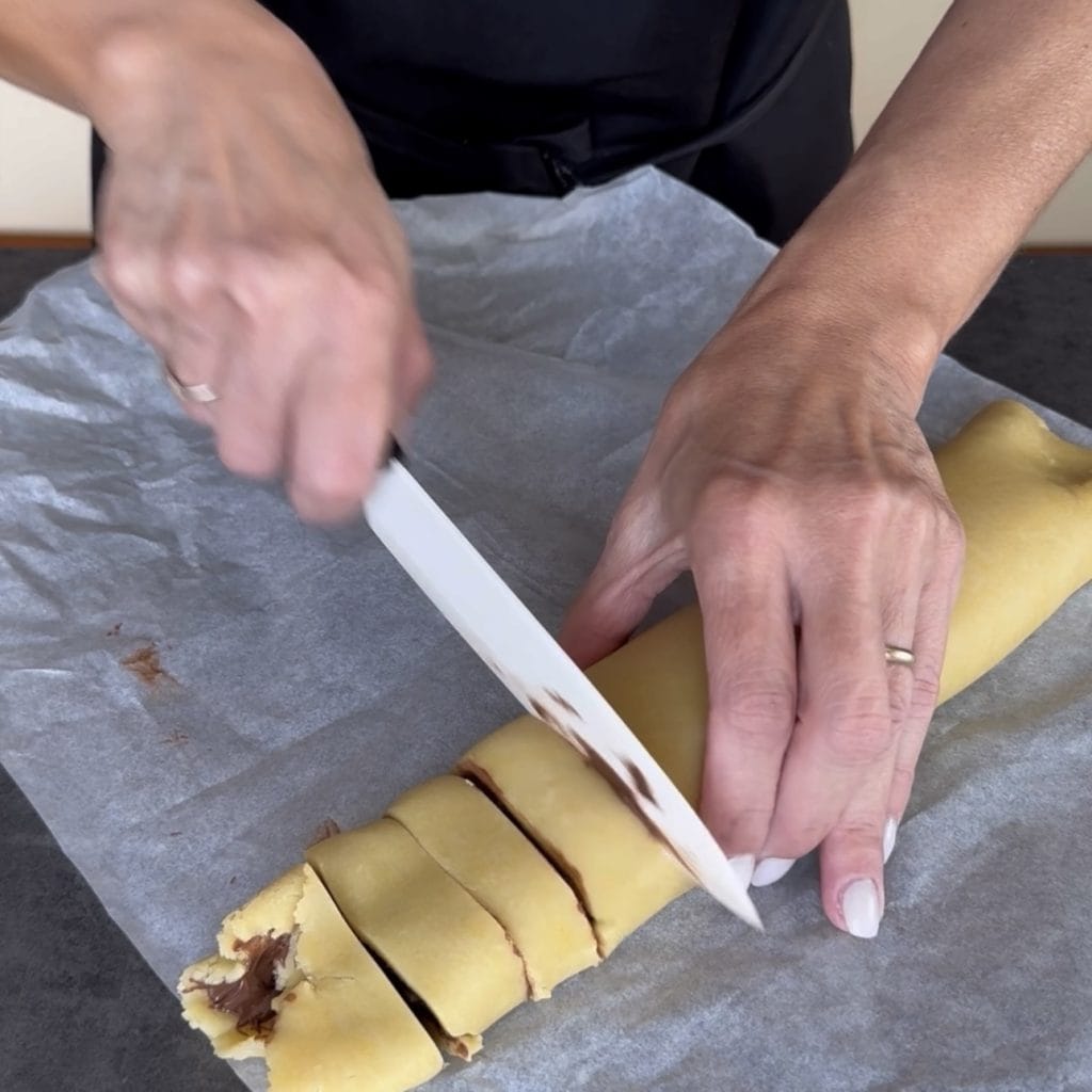 Tras el reposo, retoma el rollo y córtalo en rodajas,
