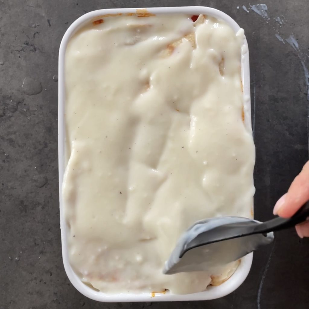 • Ahora continuad de esta forma hasta completar la lasaña. La última capa será de pan carasau siempre humedecido en agua,
