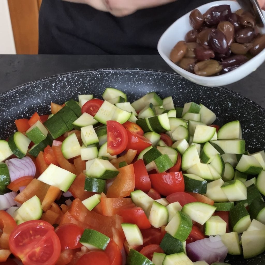 • Verted todas las verduras en una sartén amplia y añadid las aceitunas taggiasche,