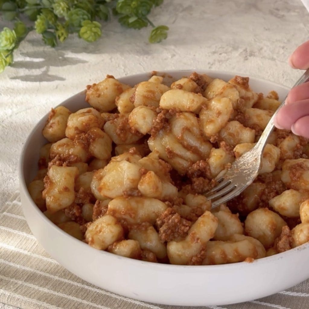 Cuando hayáis cocido todos los ñoquis, podréis condimentarlos con la salsa que más os guste, en mi caso el clásico ragú.