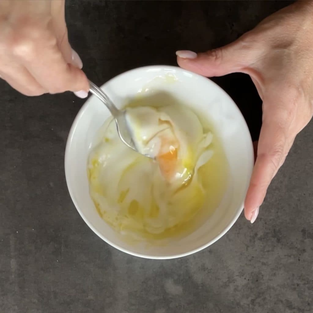 Comenzamos a preparar el Pan de molde relleno, verted en un bol el huevo y añadid una cucharada de aceite de oliva virgen extra,