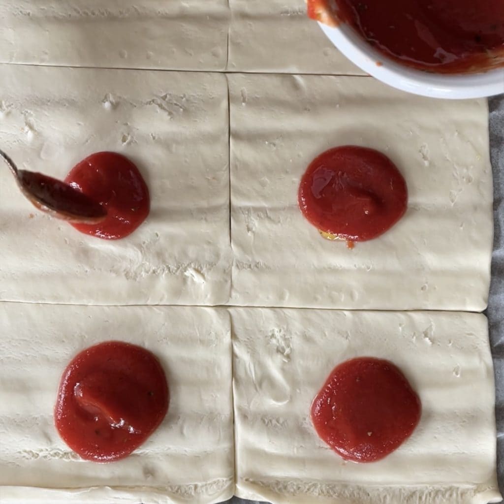 Coloca en el centro de cada rectángulo un poco de puré de tomate,