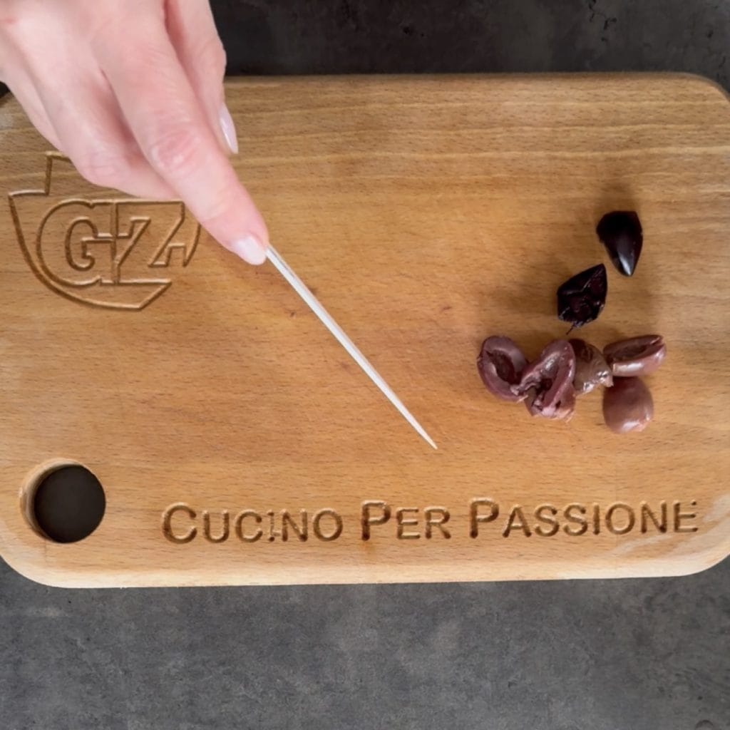 • quita el hueso de las aceitunas y córtalas a la mitad si son demasiado grandes.