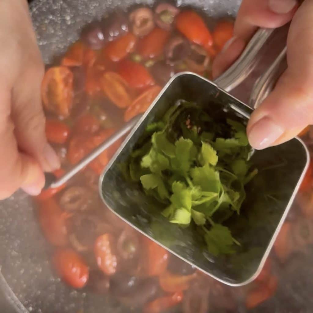 • Vierte en una sartén amplia, aceite de oliva virgen extra, un diente de ajo cortado a la mitad y los tomates cherry,
