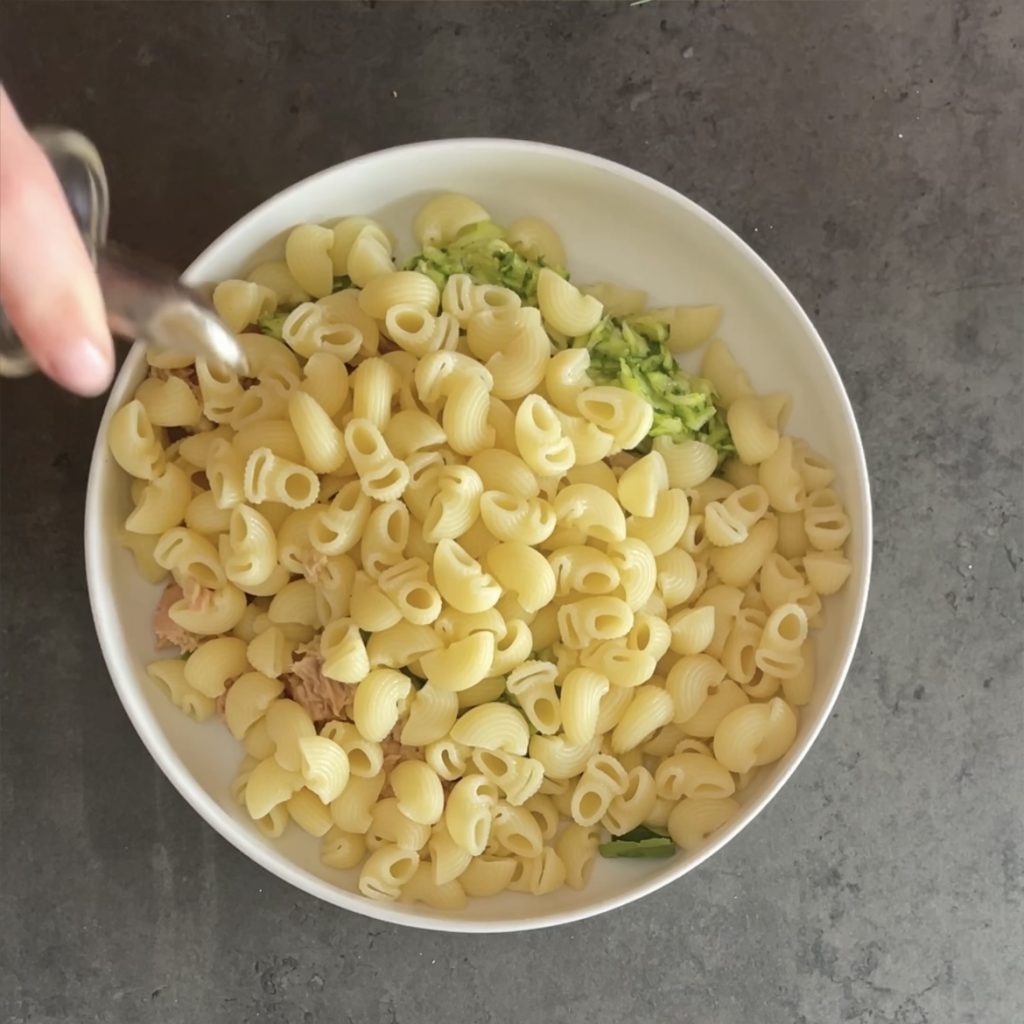 Cuando la pasta esté cocida, escúrrela, échala junto con los calabacines y el atún