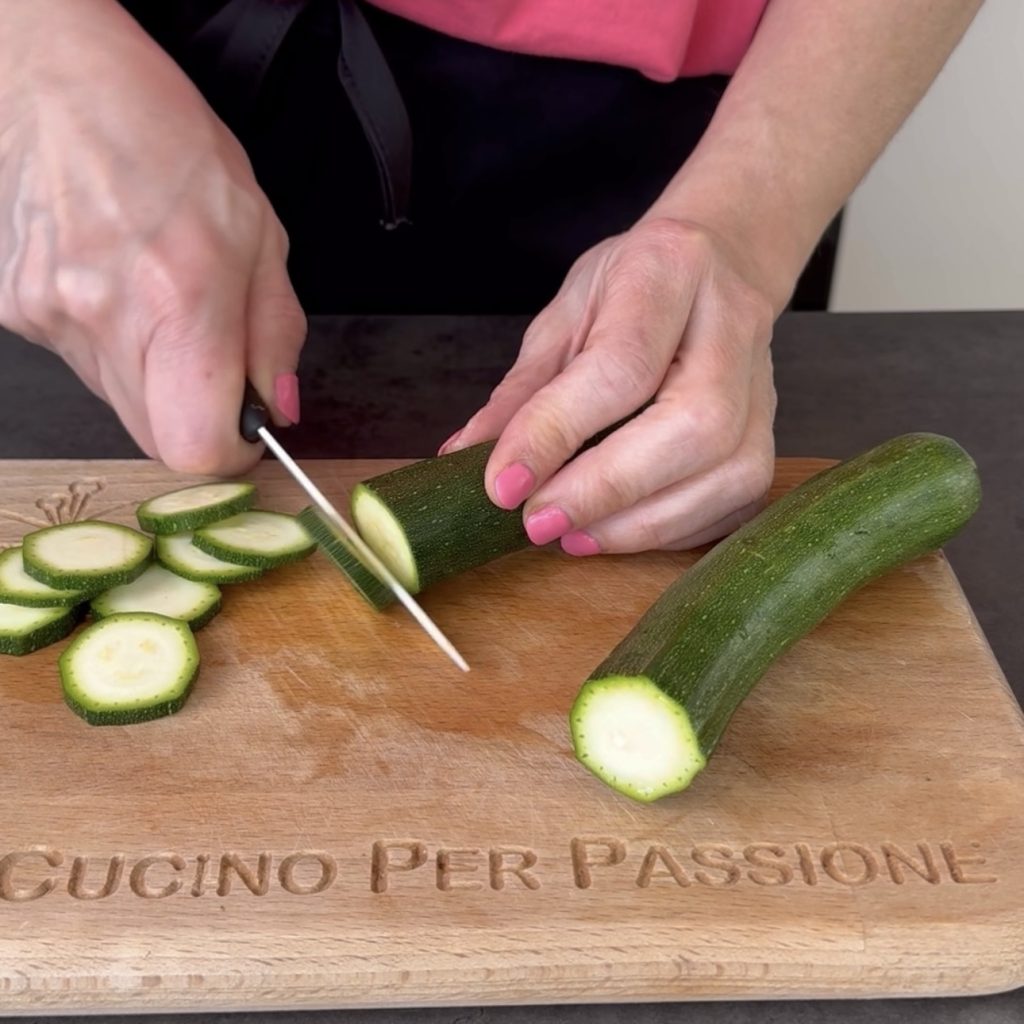 Empezamos a preparar la Pasta fría con calabacines y gambas, cuece la pasta al dente y luego déjala enfriar en un bol. Lava los calabacines, quítales los extremos y córtalos en rodajas finas,