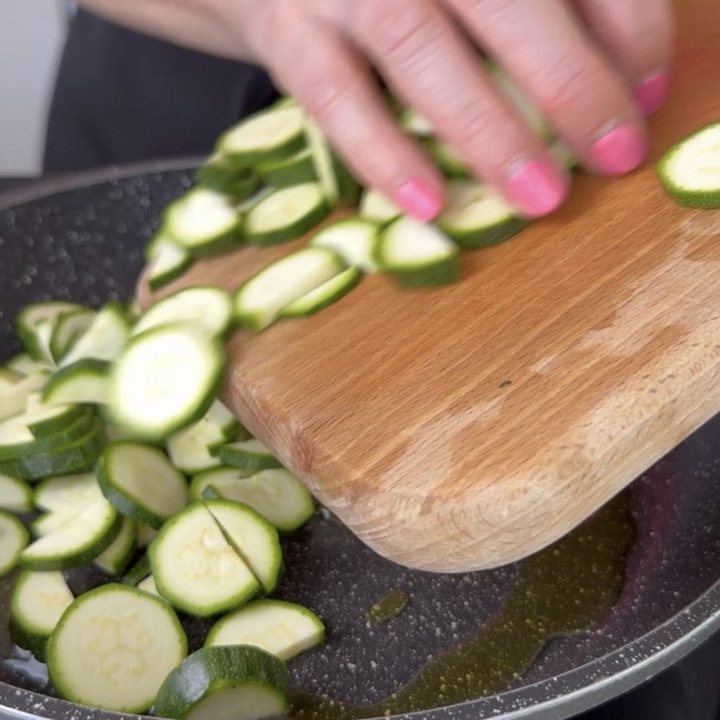 En la misma sartén donde has cocido los calabacines, añade las gambas