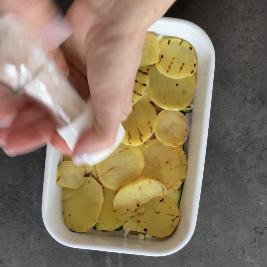 Ahora que las patatas y los calabacines están asados, podéis proceder a preparar el pastel haciendo las diferentes capas. Engrasar la bandeja,